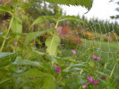 A spider was busy at work making a web and the dew was still on it amazing little creeper.