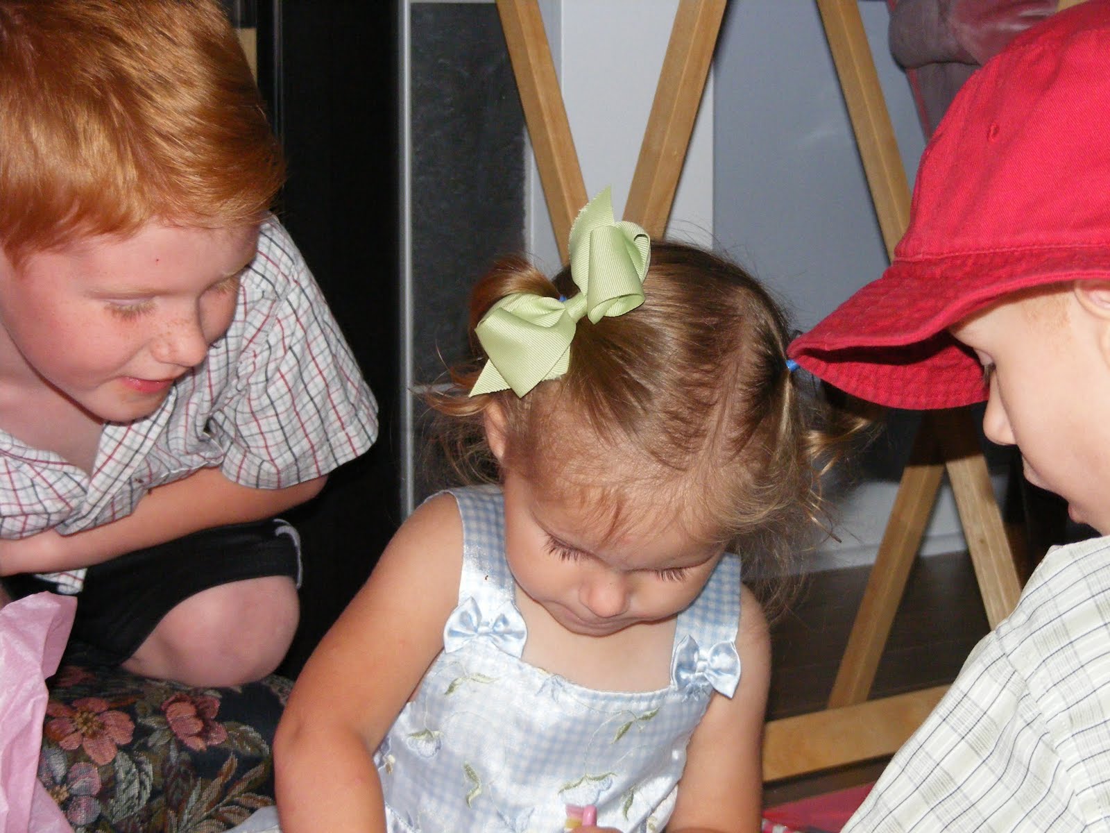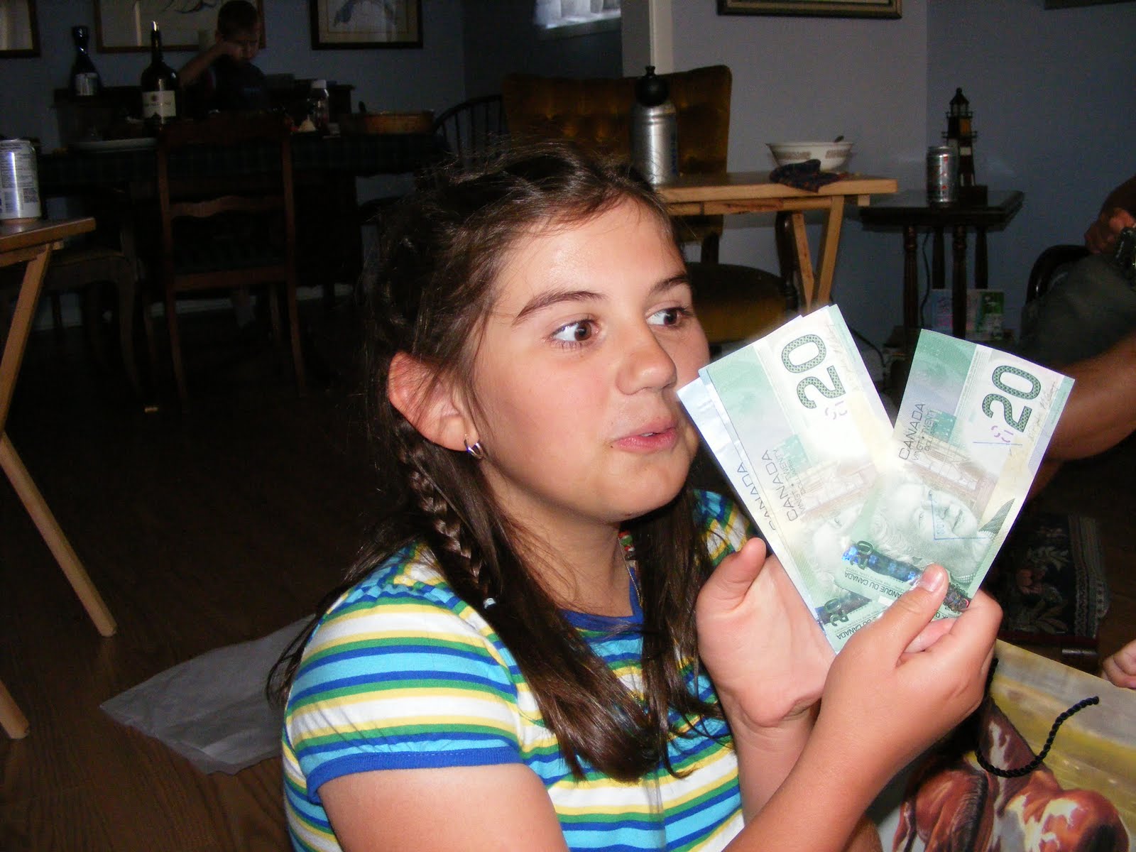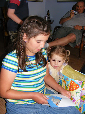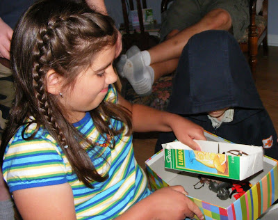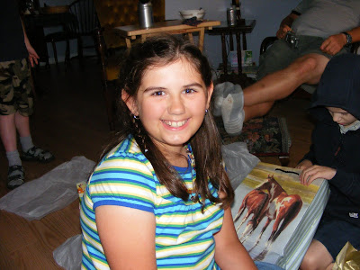 Hannah didn’t need any help blowing out her candles. When she finished her cake she hopped out of her chair and swept up her crumbs. Although Hannah studied each card like she was reading them at just 3 years old no she is not reading her own cards. Some much needed bling from Gramma! She was thrilled to get a new set of pots for her kitchen. Here is Hannah getting lots of encouragement from her brothers. I’d say she was happy with the outcome of her day!!! We always let the kids pick their birthday meals. Taliah picked meatloaf with pasta salad and corn on the cob. For fun I have recently started shaping our meatloaves into things we have had turtles, hippos etc. For Taliah’s birthday I did a horses head. Gramma suggest the olives for the eyes. Well, I am highlighting Taliah birthday, but I had to share this picture of Joel. He is missing 7 teeth in the front…he does have the two on the bottom starting to grow but they are still very small. I offered to cut them off but he insisted on eating it on the cob. Taliah’s cake had her favorite chocolate bar on it spelling Talli (we often call Taliah- Talli). Hannah felt like an expert after her birthday so she closely oversaw Taliah’s effort as Taliah opened her presents. Can you find Joel? Taliah was thrilled to get some spending money for her birthday, thankfully she is very wise about spending and saving her money. I love this picture of Taliah she has such a genuine smile. Happy 10th Birthday Taliah!!
