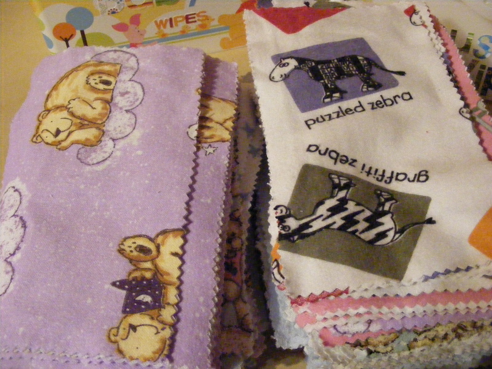 With baby’s arrival creeping up on me I decided to get to work and make some wipes for the baby, as well as the house. I started by cutting up old receiving blankets and scrape flannel that I had. I used pinking shears so I don’t need to finish the edges.