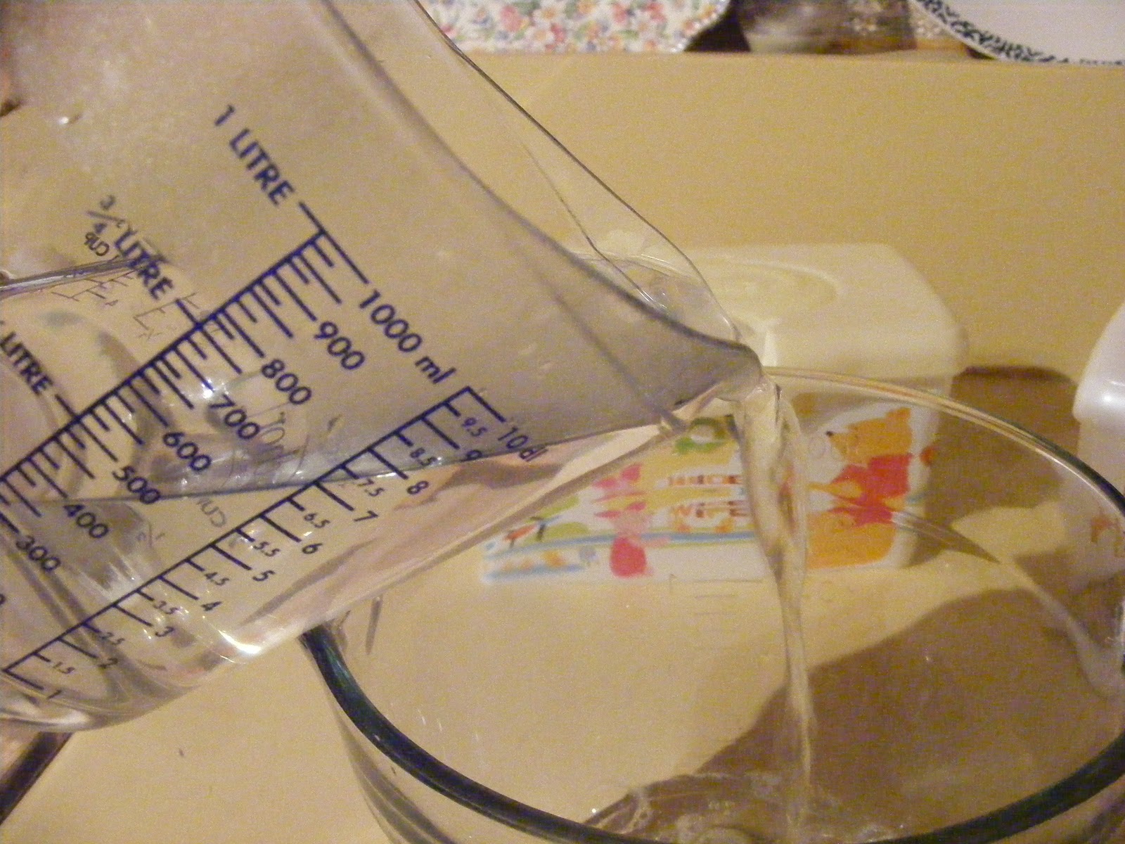 Then in a measuring cup I poured two cups of boiling water, two tablespoons of baby wash and two tablespoons of baby oil and stirred.